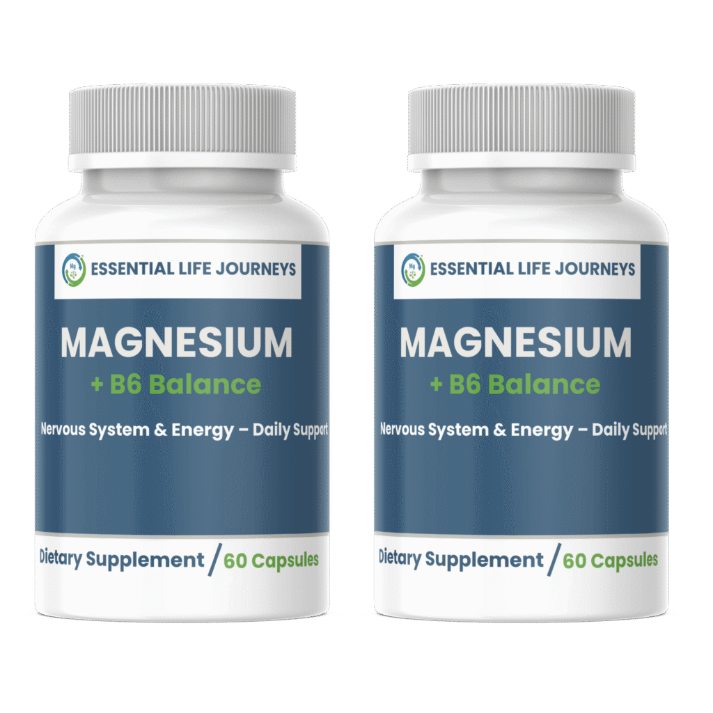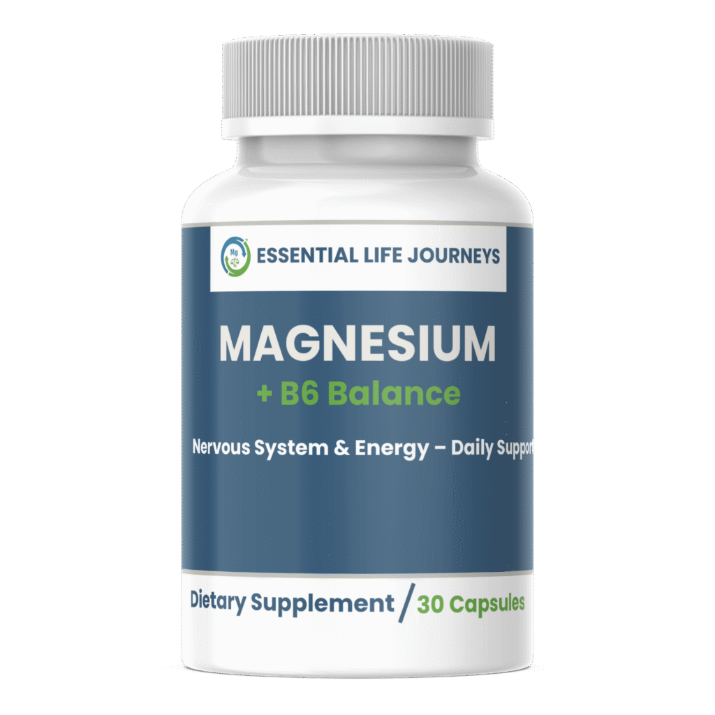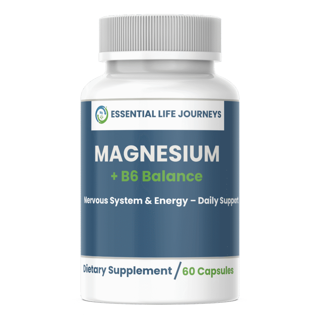 Essential Life Journeys Magnesium + B6 Balance offers a science-backed approach to daily wellness. This synergistic blend may help support stress management, nervous system function, and healthy energy levels – providing essential nutritional support for your body and mind.